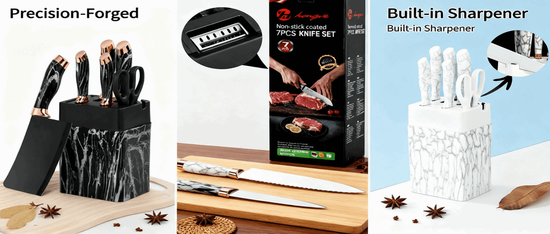 Kitchen Block Knife Set 7Pcs with Sharpener, Forged Cutlery with Razor-Sharp Stainless Steel Blades Anti-Rust Kitchen Knife Block Set, Ergonomical Design