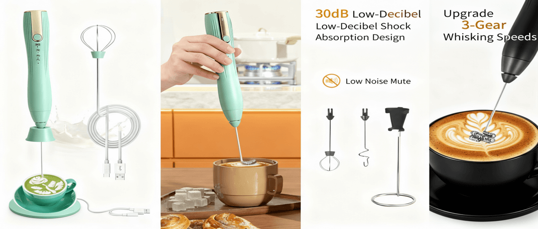 Rechargeable Milk Frother Handheld,Kitchen Essentials Hand Mixer with 3 Stainless Whisks Heads,Electric Whisk Frother for Latte, Cappuccino,Macchiato,Matcha, Egg, Milk Powder,with Stand