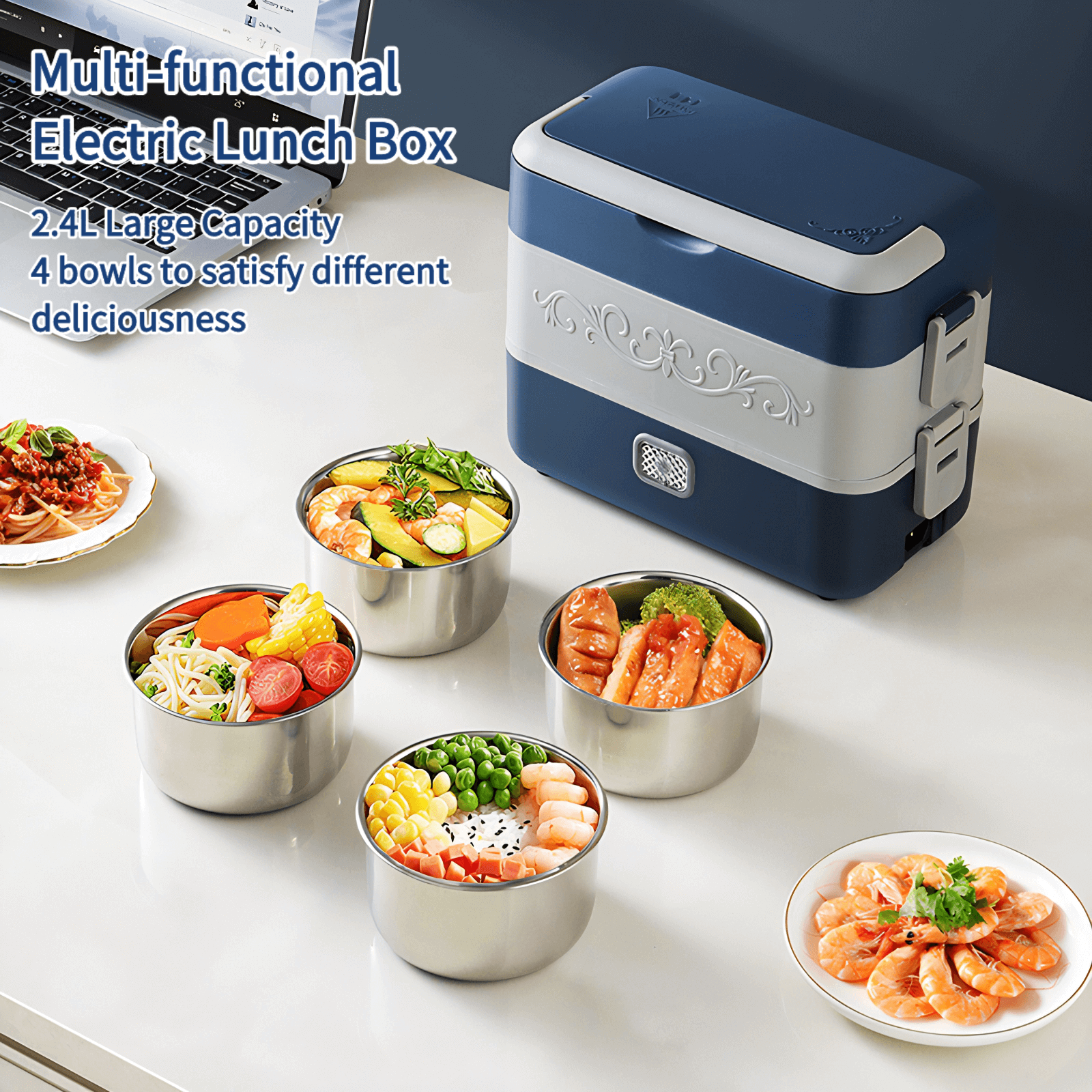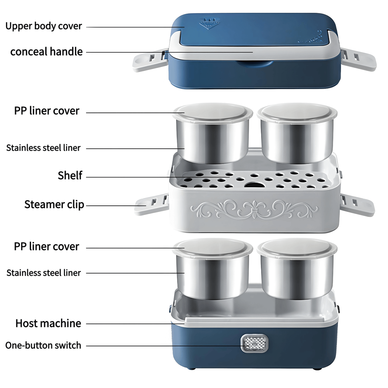 - 【2.4L Large Capacity】This heated lunch box is made of food-grade PP material & premium stainless steel with a leak-proof seal. It includes 4 removable 0.6L containers and utensils, usable in single or double-layer mode. 110V for office/home