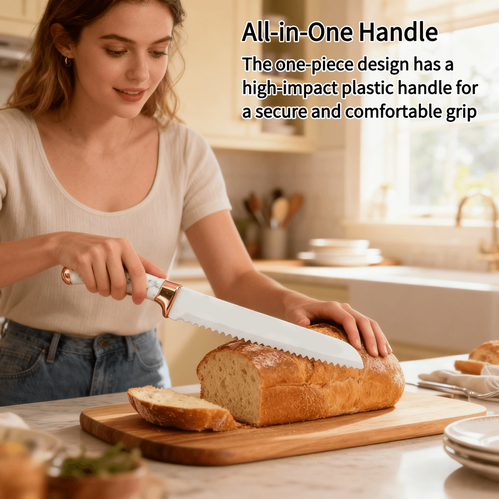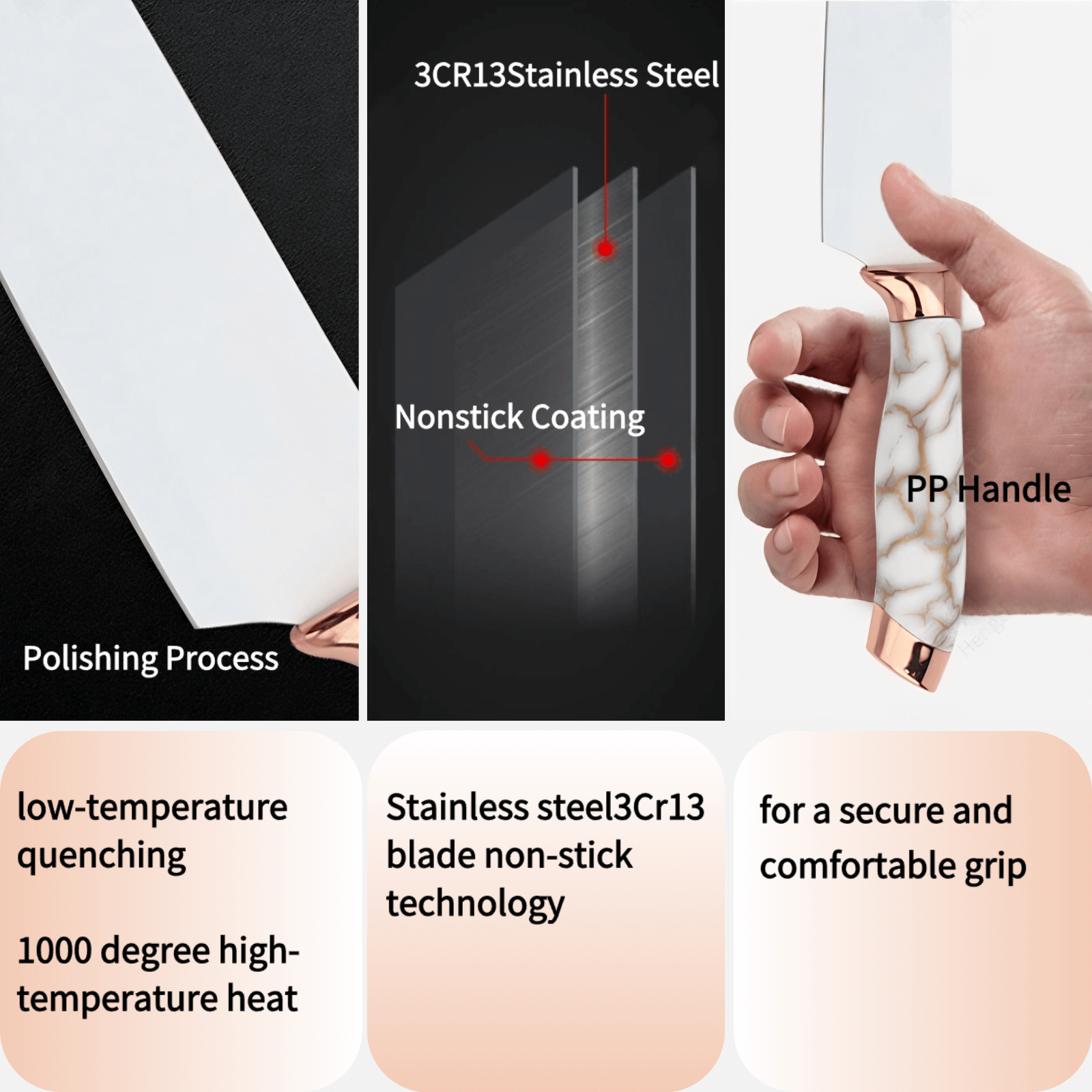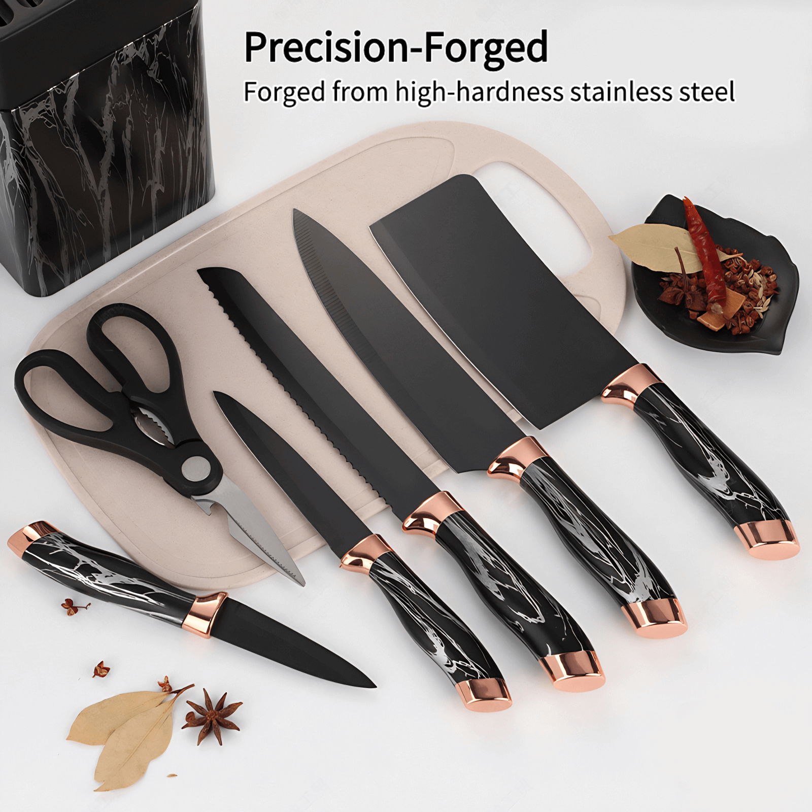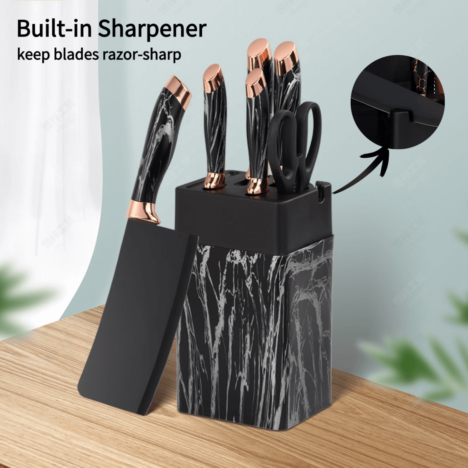 Elevate your everyday cooking with our precision-forged kitchen knife set, designed to make meal prep smooth and enjoyable. Each blade is crafted from high-hardness stainless steel, offering exceptional sharpness and clean cuts whether you're slicing, dicing, or chopping. No more struggling with dull knives—the built-in sharpener in the stylish block helps maintain that just-sharpened edge, while keeping your countertops tidy and safe.The knives feature one-piece design with ergonomic high-impact handles, providing a comfortable, secure grip through any task. Thanks to their special non-stick and rust-resistant coating, these blades stay protected from oxidation and staining, ensuring they look and perform like new, year after year.Ideal as a thoughtful gift for loved ones or an upgrade for your own kitchen, this set is built to last. And don’t worry—we’ve got you covered. If you receive any defective item, please contact us in time, we will give you a satisfactory answer within 24 hours.