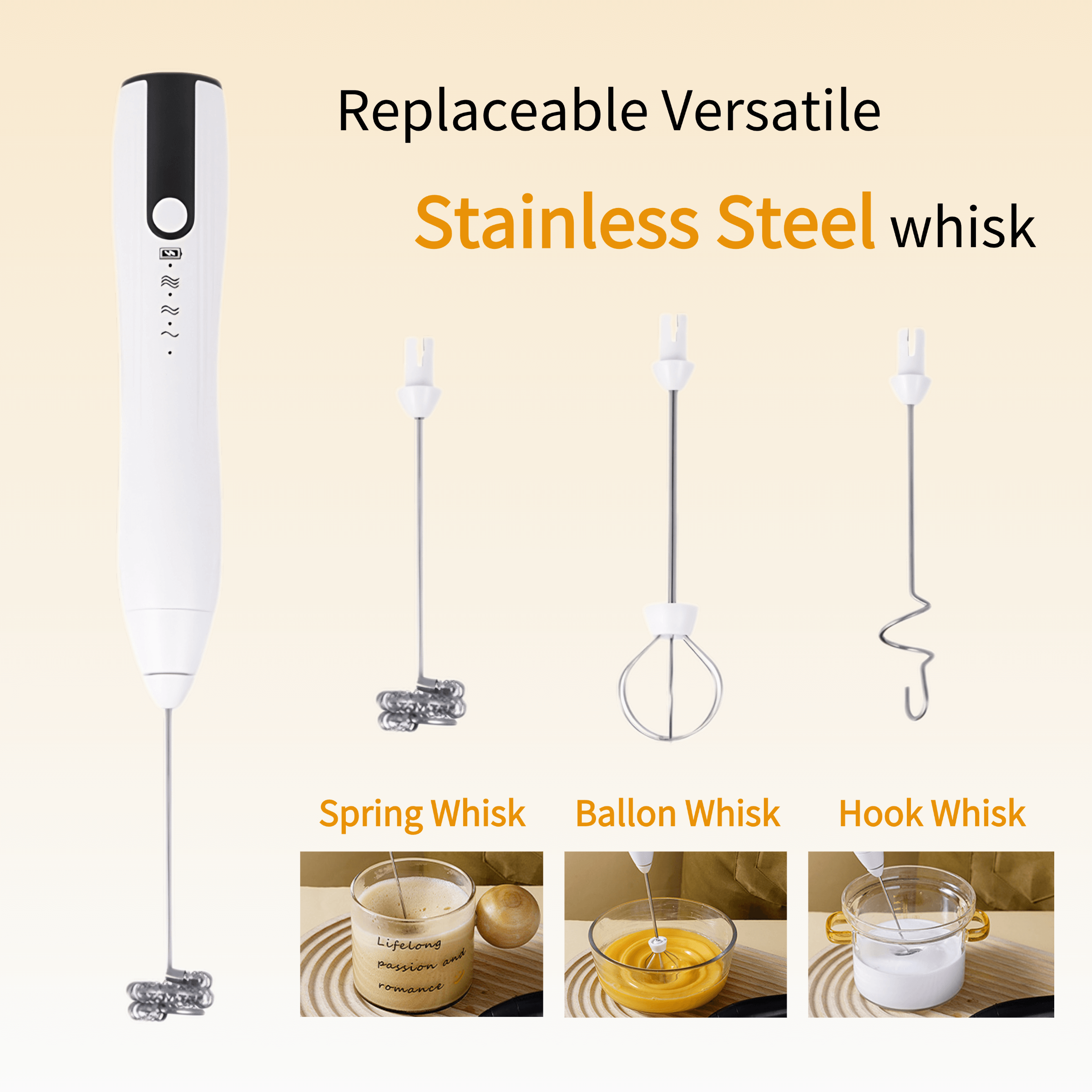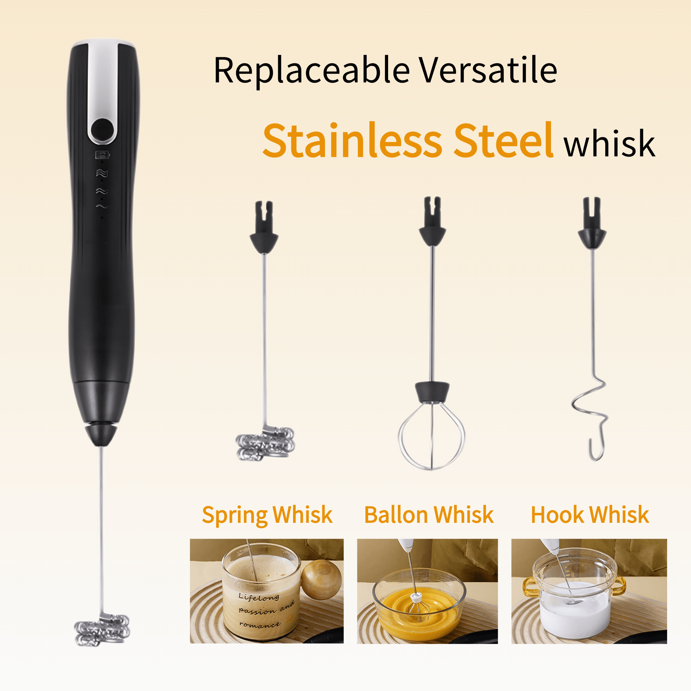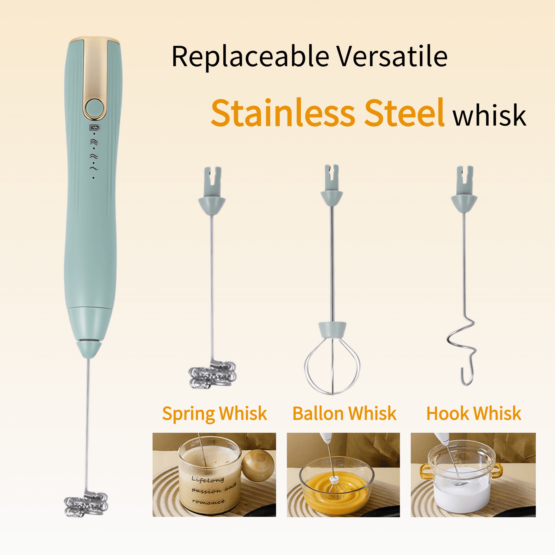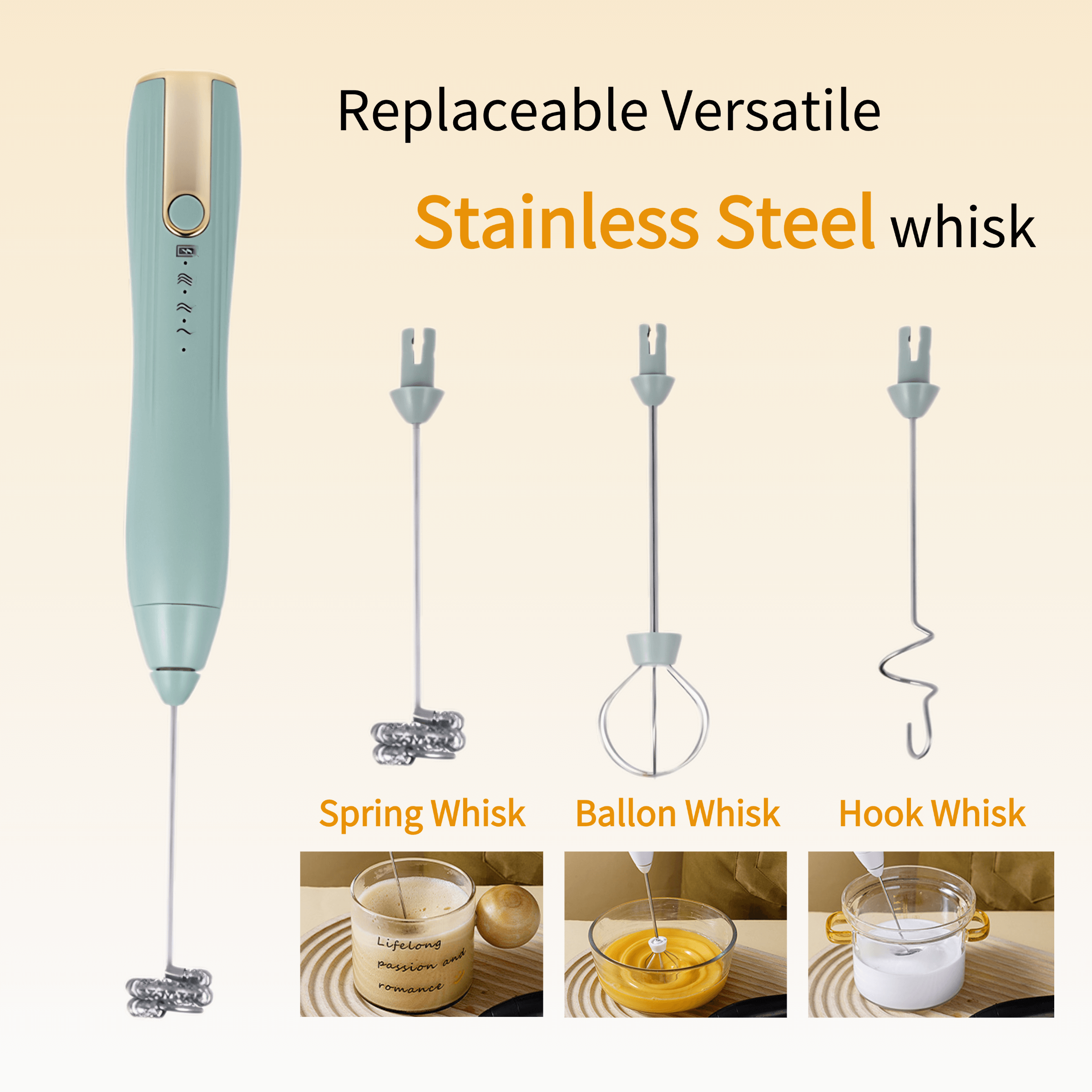 Equipped with 3 distinct stainless steel mixing heads, they can be easily swapped out based on your needs, whether it's for coffee, egg whites and yolks, or milk powder