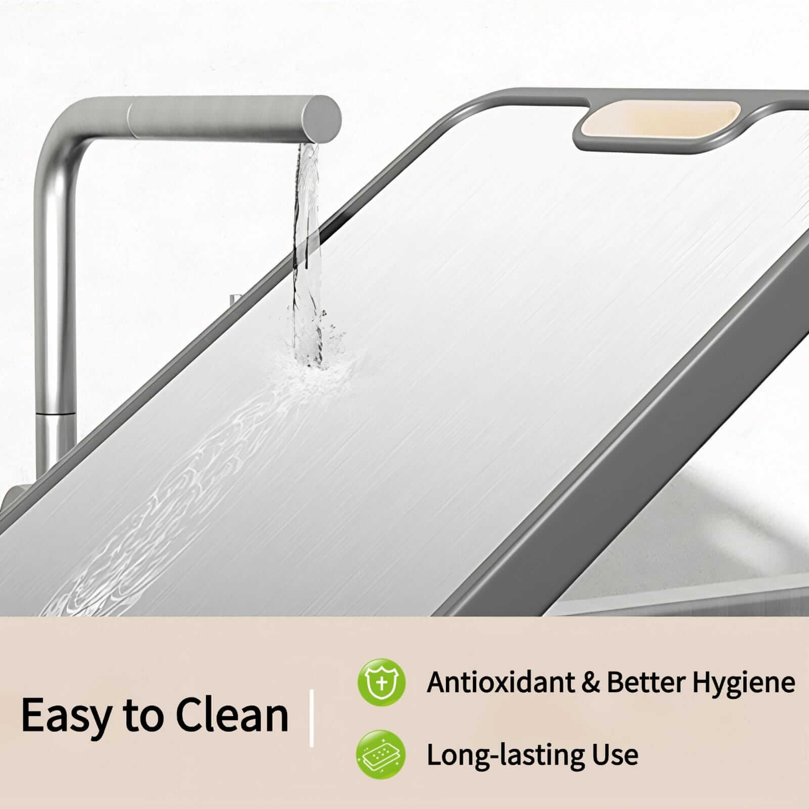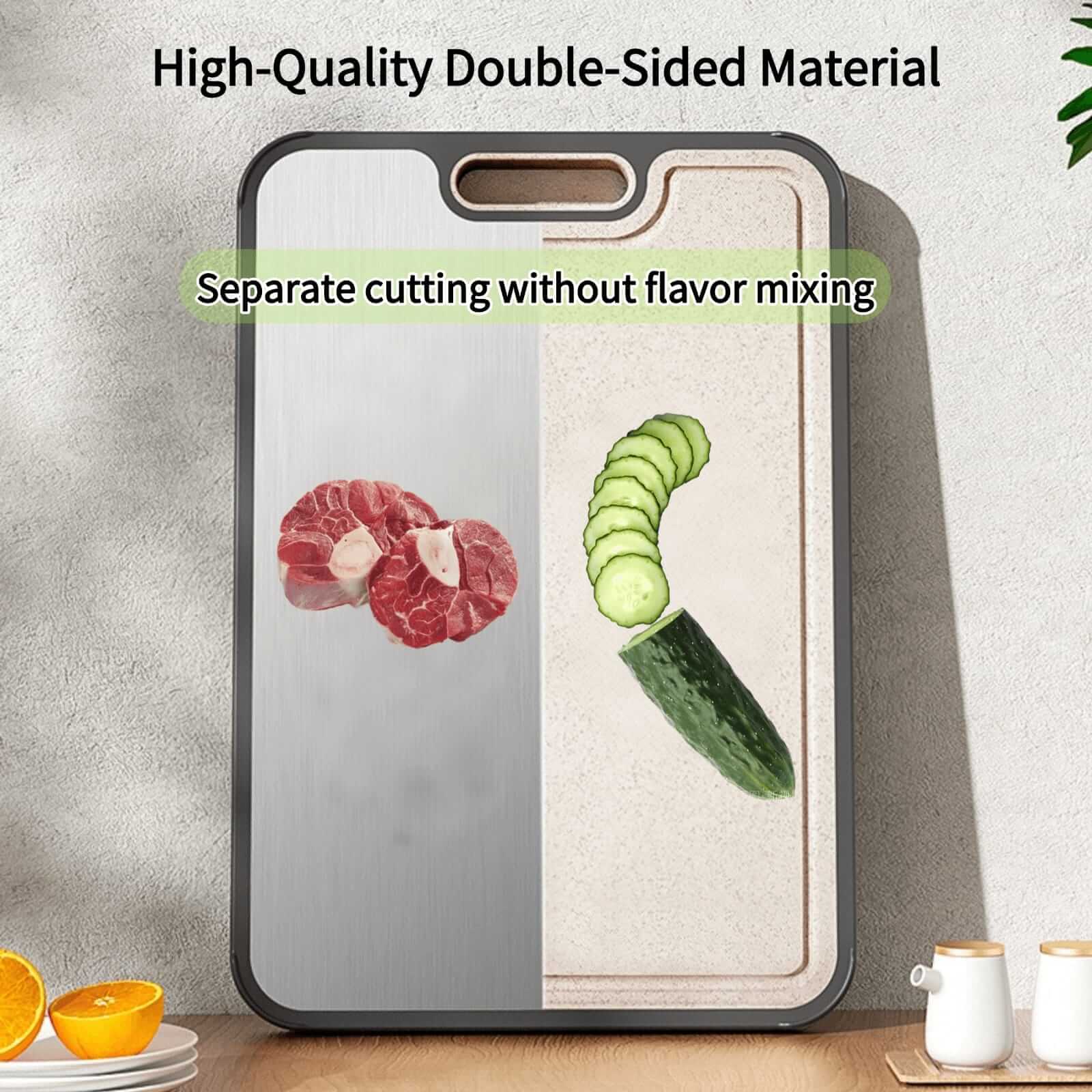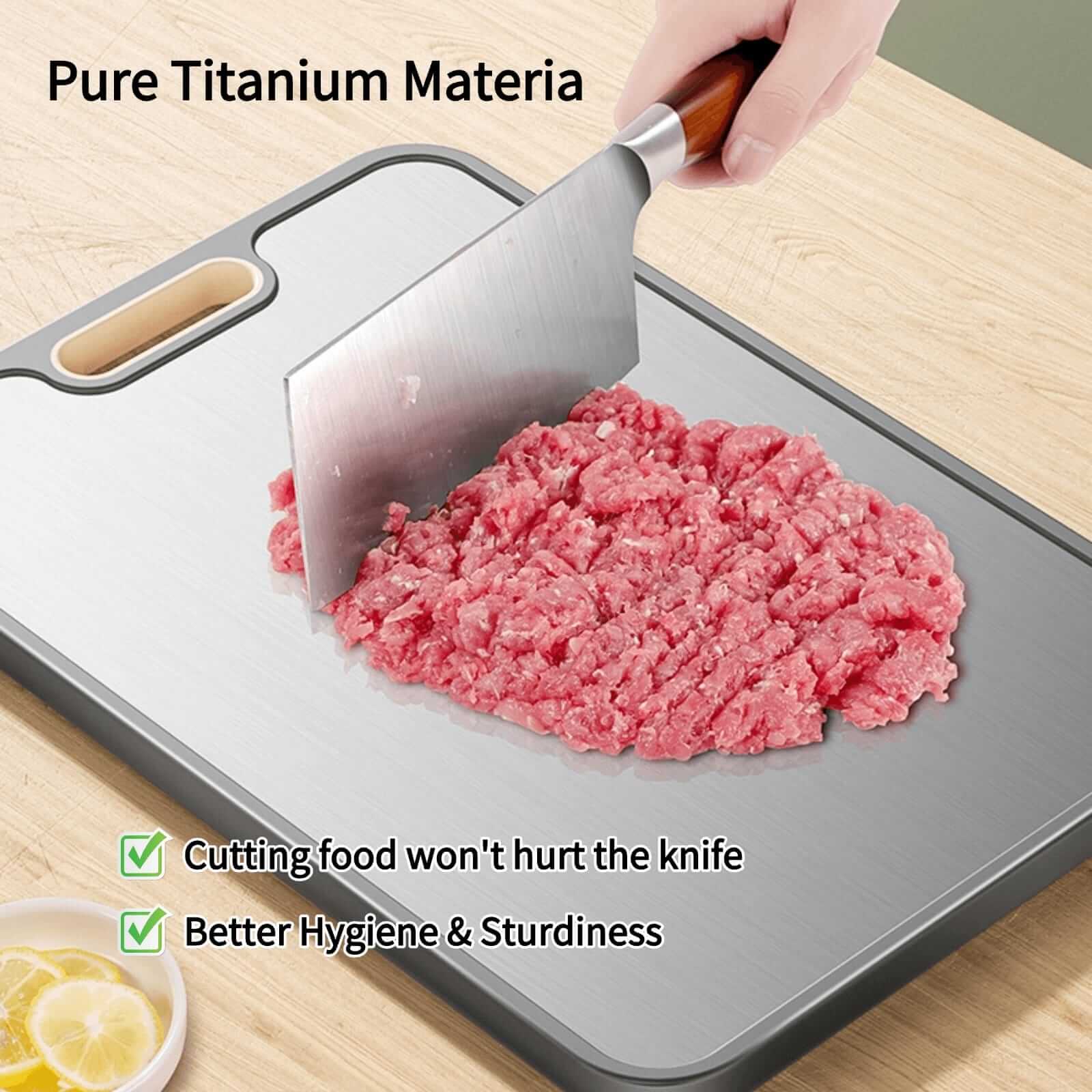 • 【DOUBLE-SIDED DESIGN】This is a 2-in-1 cutting board,with one side made of food-grade 99.9%Pure Titanium for cutting raw and cooked meat, and the other side made of wheat straw PP material for cutting vegetables and fruit.Separate cutting without flavor mixing