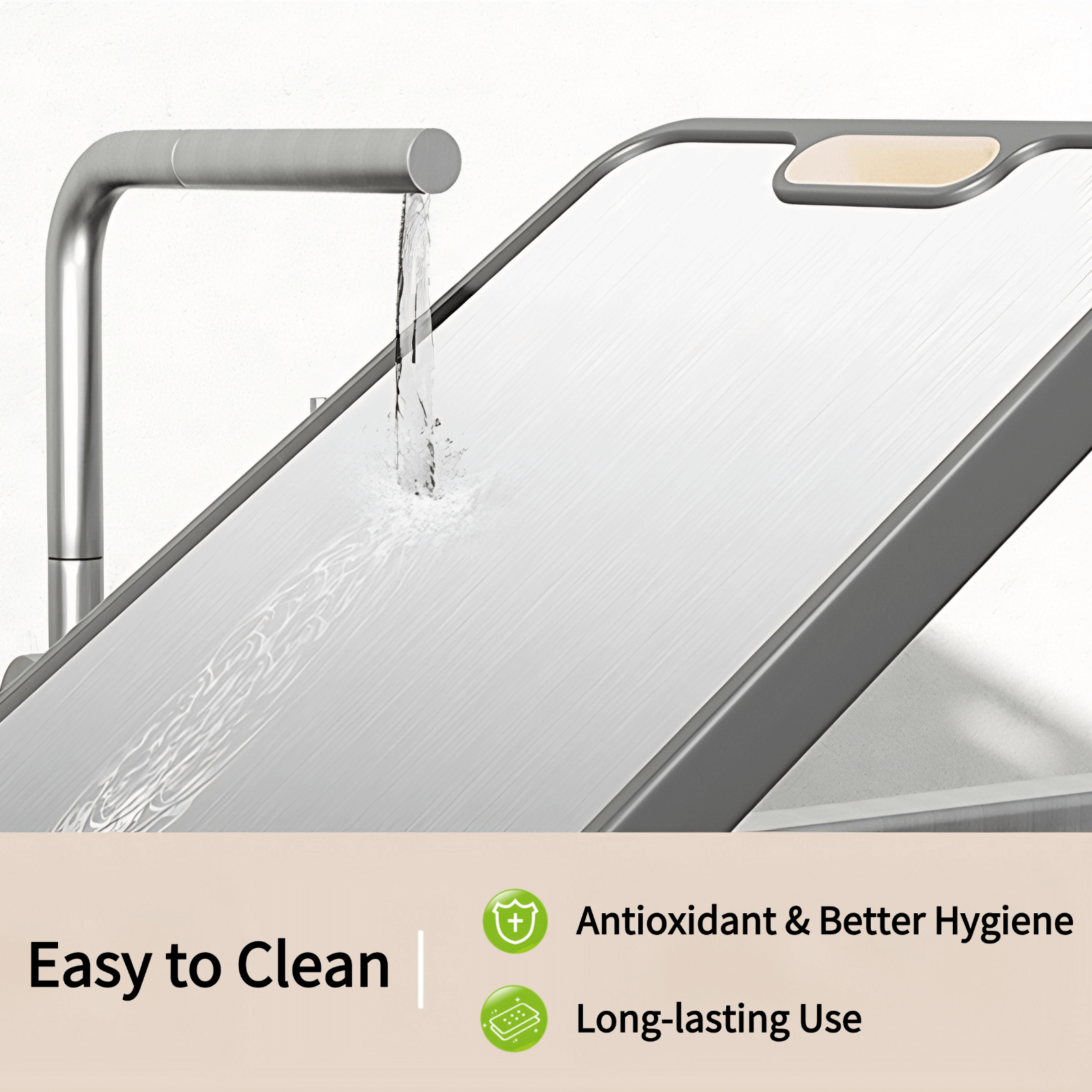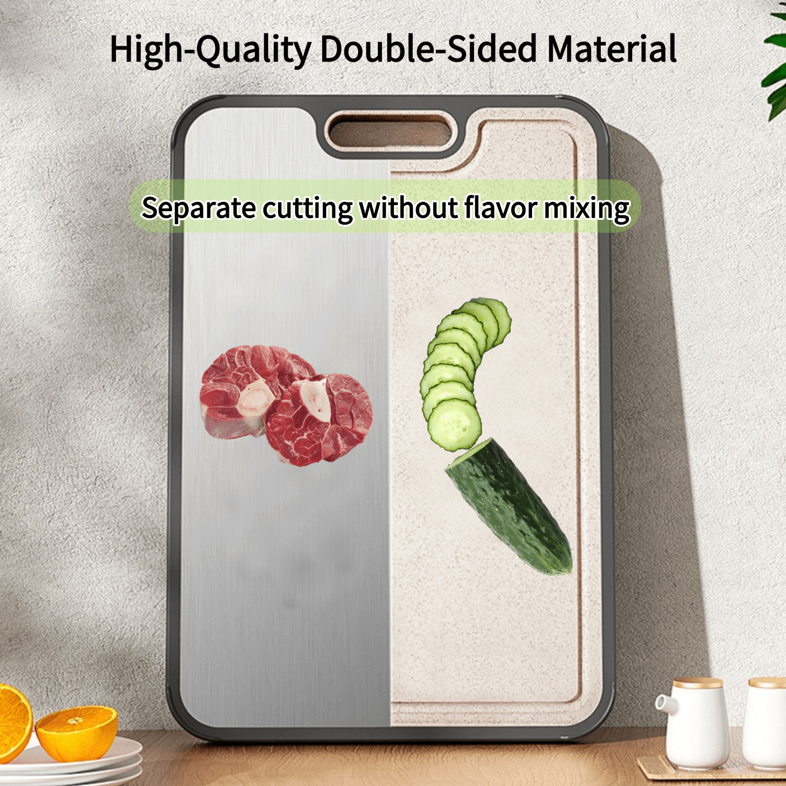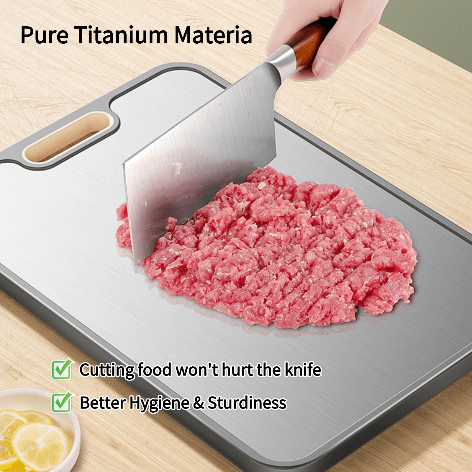 Our cutting board features one side crafted from food-grade 99.9% pure titanium, ideal for cutting raw and cooked meat, while the other side is constructed from wheat straw PP material, suitable for cutting vegetables and fruits. Its thick and scratch-resistant design enables heavy-duty cutting and precise slicing without leaving any juices behind. A high-quality, long-lasting kitchen essential, it boasts a built-in juice groove capable of collecting liquid to avoid overflow, and a textured grinding area that facilitates easy preparation of garlic or ginger, making cooking more efficient. It serves as a perfect healthy gift for holidays and special occasions, such as Mother's Day, birthdays, anniversaries, and Christmas.
